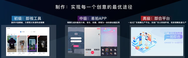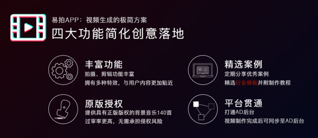 针对初级制作需求,巧匠计划推出“即视工具”,可提供丰富模版,方便图文快速转成视频。制作门槛低、成品产能高和模版应用多的特点,使得“即视工具”能够满足品牌主的初级视频广告制作需求。 如果图文转视频不能满足需求,巧匠计划推出的“易拍APP”则提供了中级解决方案。“易拍APP”为用户提供视频生成的极简方案,四大功能简化创意落地。丰富功能:拍摄、剪辑功能丰富,拥有多种特效,助力用户内容创作。原版授权:初期拥有正版版权的背景音乐140首,无需担心版权风险。