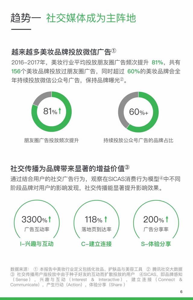 近年五年来,中国美妆行业发展迅速,营业额年均增速超15%。根据"一带一路"中国(时尚)品牌国际化论坛上提供的数据显示,去年中国美妆行业营业额超7600亿元,市场规模超过日韩两国。2023年营业额预达1.64万亿元。 而社交媒体平台也逐渐成为美妆行业营销的主阵地。近日,腾讯社交广告与微信广告发布了《2018微信广告美妆行业洞察及产品解决方案》,小编将报告中的重点信息进行了简单的梳理分析。 报告重要摘要: 1.社交媒体更是美妆品牌营销的必争之地。 2.明星KOL代言和有创新的广告形式,更受年轻消费者的喜爱 3.男性美妆市场发展速度加快,未来三年中国大陆男性护肤及美妆市场平均零售额增长可能达到13.5%。 4.线上线下打通,AR试妆镜为用户提供了新体验。 5.美妆行业已经全面拥抱小程序。 中国美妆行业营销趋势 中国正在成长为全球最大的美妆市场,其中社交媒体更是美妆品牌营销的必争之地。报告显示,在近一个月美妆品牌相关网络声量超过90%来自社交媒体。 作为拥有10亿月活用户的微信,在2016年-2017年期间,美妆行业平均投放朋友圈广告频次提升81%。同时,为保持品牌持续曝光,60%的美妆品牌会持续投放微信公众号广告。