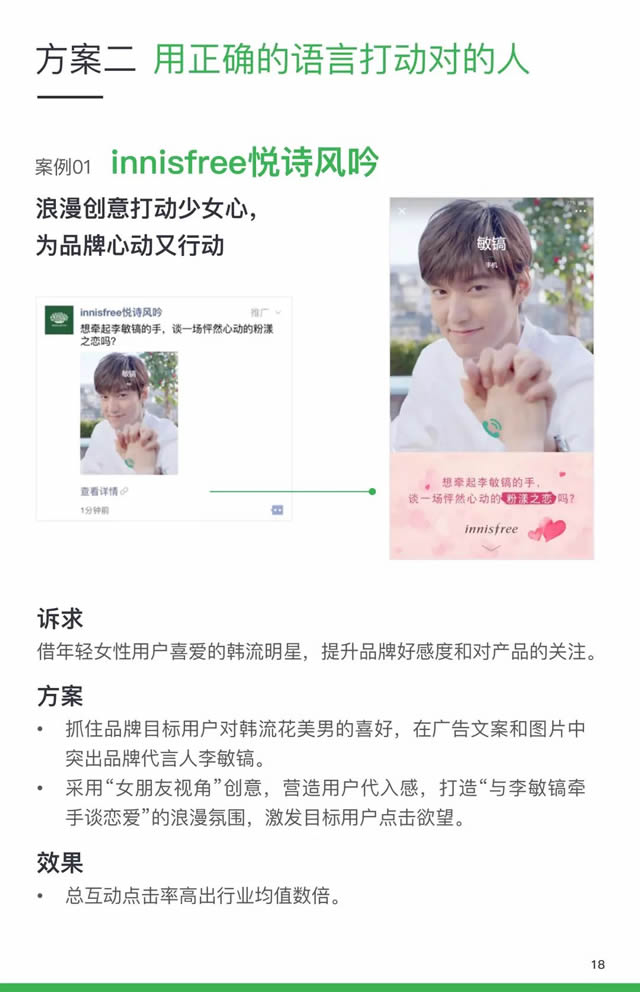 事实上,除了在微信上,微博、小红书等,也是美妆行业投放的重点之一。比如,微博上拥有庞大的头部达人,像明星、网红等等,通过微博博文可以触及更多的潜在粉丝用户,或利用微博的精准投放,将产品展现给合适的目标人群等等。而据《IT时报》报导,小红书头部达人每篇(笔记)广告报价更是高达15万至20万元。 同时,随着年轻一代护肤化妆意识崛起年龄越来越早,美妆品牌营销呈年轻化发展趋势,80后、90后现在已成为美妆主力消费人群。 针对年轻用户,采用具有互动性的,拥有创新的广告形式,以及选择年轻一代喜欢的明星KOL或垂直KOL代言,更受年轻消费者的喜爱。其中明星KOL和垂直KOL带货能力强,对美妆目标人群购买决策起重要影响作用,且年轻人更容易受KOL影响。 其次,美妆消费者在选择产品时,也更加愿意选择与自身价值观相符的品牌。比如,悦诗风吟,通过对品牌目标消费者的洞察,针对用户韩流花美男的喜好。在广告文案和图片中突出品牌代言人李敏镐,用“女朋友视角“,营造用户代入感,打造浪漫气氛,激发用户点击欲望。
