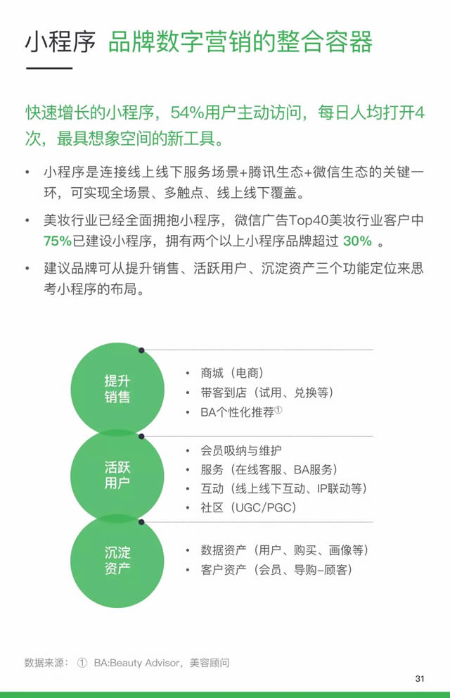 另一方面,男性护肤意识的提升和消费升级,推动男性美妆市场发展速度加快,未来三年中国大陆男性护肤及美妆市场平均零售额增长可能达到13.5%。根据QQ大数据《95后审美观》显示,近四成95后接受男性日常化妆,男性在面霜、香水上的花费也越来越多。实际上在国内,类似欧莱雅的中高端品牌,也愈加注重男性市场。 同时,随着消费者个性化需求,小众美妆品牌和其他细分品牌(比如,药妆品牌)成为新的竞争力量。 而线上线下的打通为消费者提供了新体验,比如,在线下设立AR试妆镜,改变品牌与消费者互动形式,为消费者提供更好的消费体验。而在京东上,美宝莲等美妆品牌,均已上线线上试妆模式,让消费者提前试色,选择更适合自己的商品,最后完成购买。 微信小程序成为美妆行业未来营销新趋势? 此外,美妆行业已经全面拥抱小程序。报告显示,微信广告Top40美妆行业客户中75%已建设小程序。 消费者点击朋友圈广告能够直达小程序,同时基于微信算法推荐,锁定品牌代言人背后的粉丝群体进行精准触达。打通品牌会员,将线上流量导流到线下,BA(美容顾问)个性化推荐,在线客服等等。