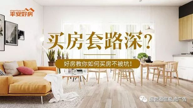 主视觉:整体画面以暖色系为主,给用户温暖感。使用中心构图,将重要信息置于视觉中心区域,有利于用户在最短时间内抓取广告信息。 洞察力:“买房套路深”房产是现社会主流话题,文案以疑问句形式,明确产品卖点,吸引需求用户关注。 品牌元素:LOGO清晰,运用平台的知名度,提升用户信任感。