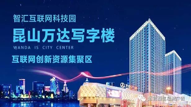 主视觉:整体使用左右结构,视觉上清晰易分辨,蓝色背景给人高端商务的感觉,配合真实图片高质清晰,带入感强,有效提升用户好感度。 洞察力:“昆山万达写字楼”明确产品卖点,利用产品品牌知名度吸引用户关注;“互联网创新资源集聚区”表明品牌优势,吸引用户。