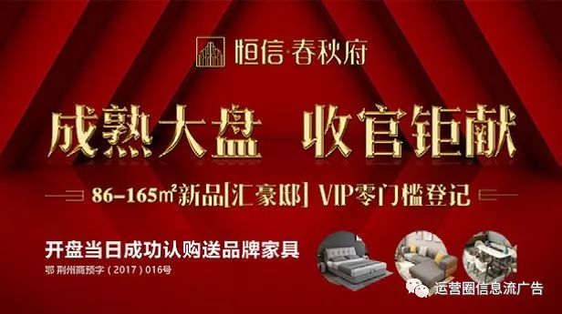 主视觉:主色调色彩明亮抢眼,能够烘托出产品活动的氛围,吸引用户目光,文案与背景对比强烈,突出文案主题。 洞察力:“成熟大盘 收官钜献”明确阐明主题“开盘当日成功营销公司主要做什么认购送品牌家具”利用用户求利心里,增强用户的购买欲。 品牌元素:LOGO位于中心区域,视觉突出,增加用户信任感。