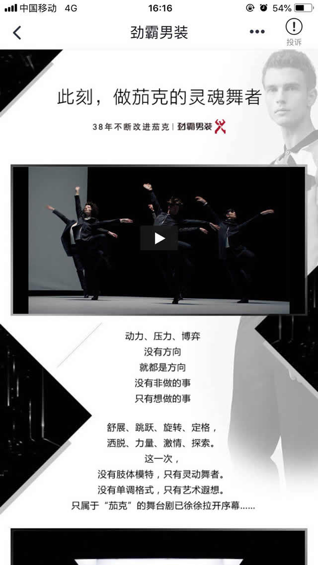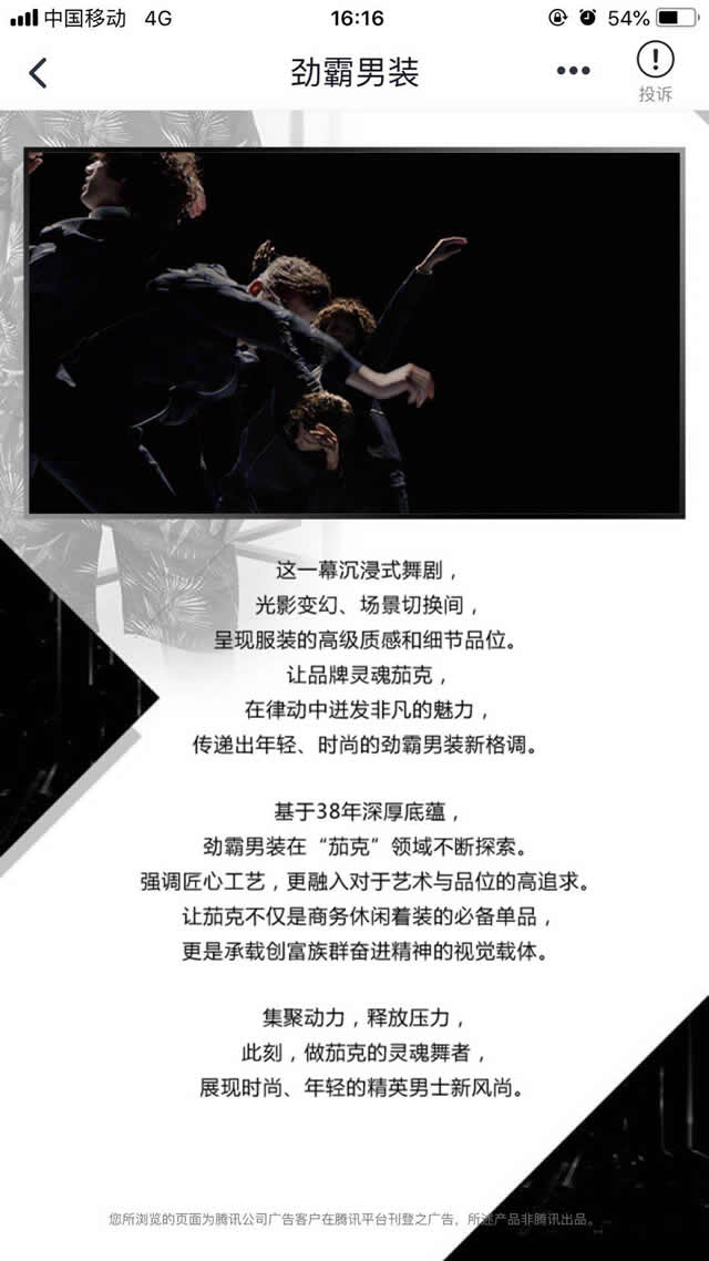 颈霸男装主推的产品是针对男性而推出的茄克,因此在广告风格方面需要符合大部分男性的要求。颈霸男装在广点通推广是以视频信息流广告的形式展现的,无论是文案还是视频内容都将茄克的特点表达了出来,例如:文案的灵魂舞者以及视频广告的舞蹈表演,都表达了这款衣服的时尚以及舒适的特点,善用行业对比以及借用创意延伸也是广告主必须具有的优势。