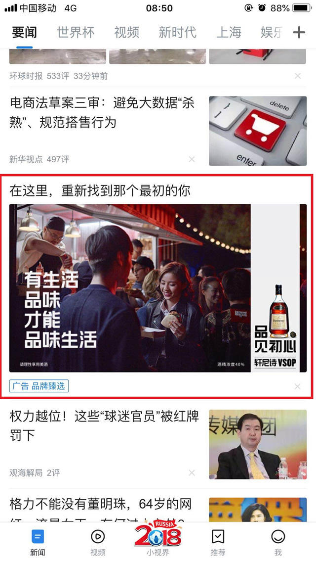 轩尼诗这则广告是选择在腾讯新闻的要闻页投放的大图文信息流广告,文案直接展示了产品的走心销售风格,例如:在这里,重新找到那个最初的你。不仅和轩尼诗推出的产品宣传语(品见初心)一致,同时吸引了消费者的注意,促使消费者点击。