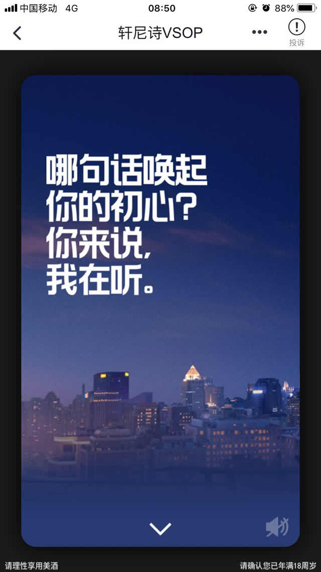 在落地页方面,轩尼诗也是贴合走心的信息流广告首页而设计的,一直以“初心”为切入点,我们可以在广告中看到落地页展现的首先是:哪句话唤起你的初心,你来说,我来听,首先让人想到的就是“我有故事你有酒吗?”。走心之外,更加入了说故事情结,高效的利用了落地页的功能。