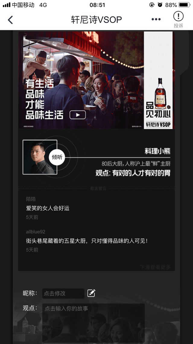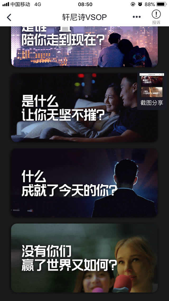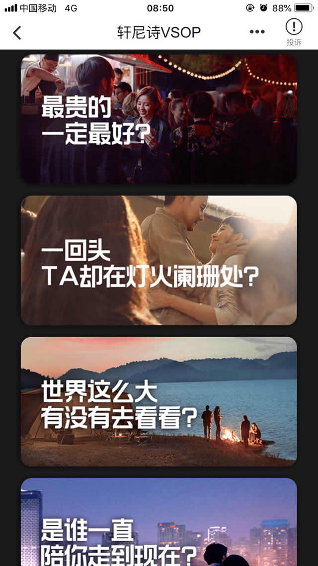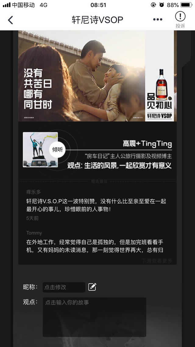 在走心以及故事层面,轩尼诗分别用不同的文案以及用采访的形式记录不同的人对产品的感受,这种方法和话题互动有相似性,轩尼诗以故事征集的方式吸引用户参与,不仅提高了用户的参与度,同时也提升了品牌影响力。