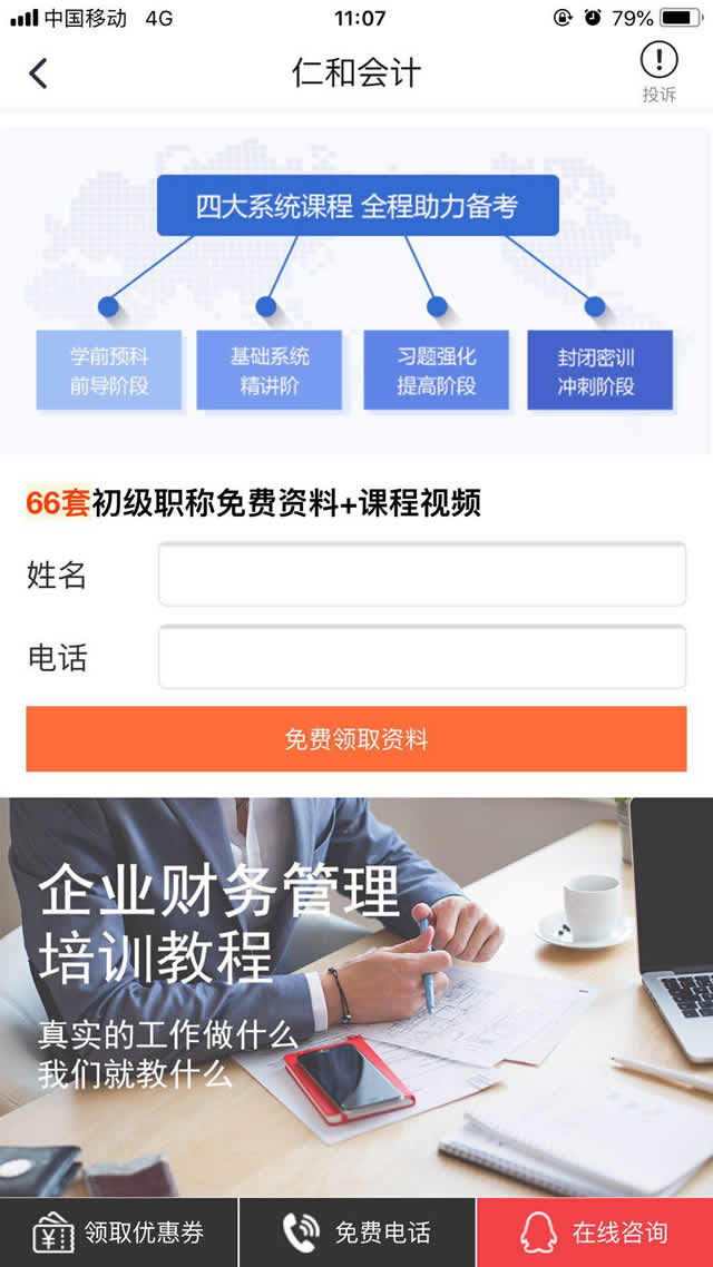 另外还有比较好的一点是仁和会计设置了电话咨询以及在线咨询,不仅可以促使用户互动,留下更多的用户信息,还可以提升用户好感度。