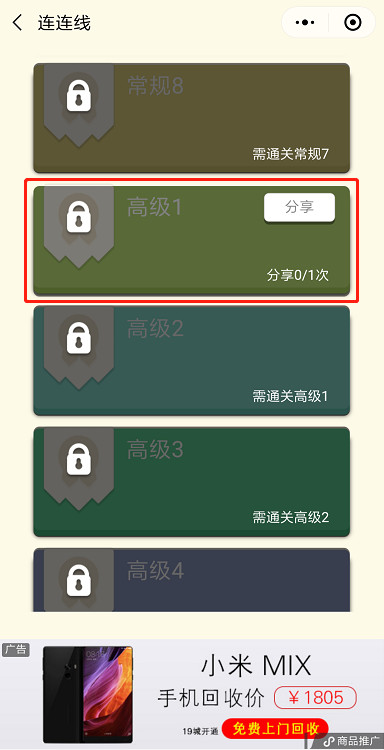 前段时间,微信改版,引发了不少热议,甚至都超过了目前的世界杯。但大多数人都只是在说微信焦虑了,如此克制的微信都增强了信息流模式。但其实订阅号改版,不仅仅如此,它也使得整个微信生态的流量相对于之前可能会更均衡的分别,非常有利用将订阅号、服务号、小程序打通。 对于坐拥8亿流量的微信,它不缺用户的认可,它不过是在引导用户的习惯而已。且据618数据显示,京东购物的小程序在618期间累计用户近1.7亿,下单用户比去年增长了66倍。 小程序的存在已不容忽视。一般而言,只有及时站在风口上的人才能获利,对于小程序而言,我们要如何推广呢?其实小程序上线至今,已经有了多种推广方式,包括公众号、广点通、小程序互推、附近的小程序、社群等。只要愿意花钱花心思,推广不再是难事。 重要的是怎么让用推广触及到的100个用户产生裂变,变成500个、1000个,甚至像滚雪球一样达到爆发式增长,让数据“跑”起来,就不简单了。小程序只有具备了一定的传播性和感染性才可能成功。而小程序又寄生于微信生态,研究微信生态下的传播规律成为重中之重。 虽然,有不少小程序通过诱导分享实现了火山爆发式的增长,但随着小程序的发展,限制小程序诱导分享的相关规定也越来越完善。怎么在不触碰红线的情况下,让小程序具备传播性和感染性?值得我们探讨。 设计分享场景 首先开发者可以根据小程序定位,设计一些分享场景,让用户心甘情愿地转发小程序,产生裂变。 1. 解锁更多功能 开发者可以在小程序里设置一些锁定的场景,让用户通过分享才能解锁。 “连连线”是一款连线的关卡小游戏。用户画出一条线连接颜色相同的两个点,成功同时连接全部点,即可通关。其中一些特殊关卡,需要用户分享才能开启。