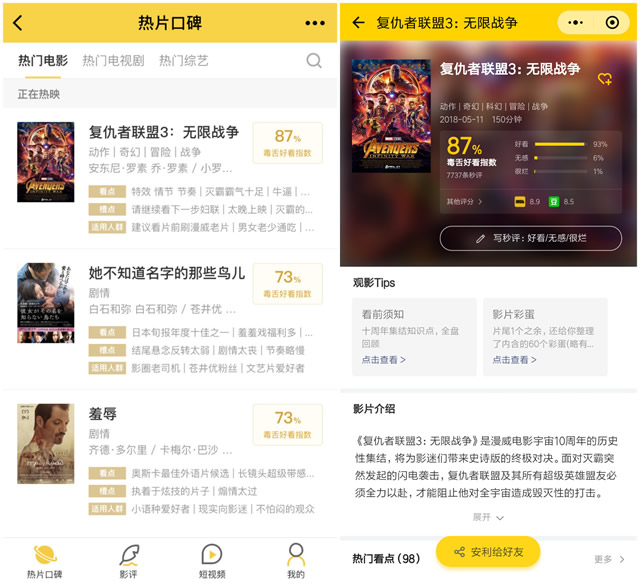2. 做运营活动 做运营活动能为小程序在短时间内带来大量流量。开发者可以根据小程序功能,设计相关活动。 在《复联3》上映头几天,“电影秒评”做了一个“秒评《复联3》赚红包”的活动。用户带票根发《复联3》观后感,就可以获得最高10元的现金红包,邀请好友还能拿到额外的45元红包。红包活动在37小时内吸引超过5000位用户参与,让上线一个月的小程序有了十倍的数据增长,日UV破万。