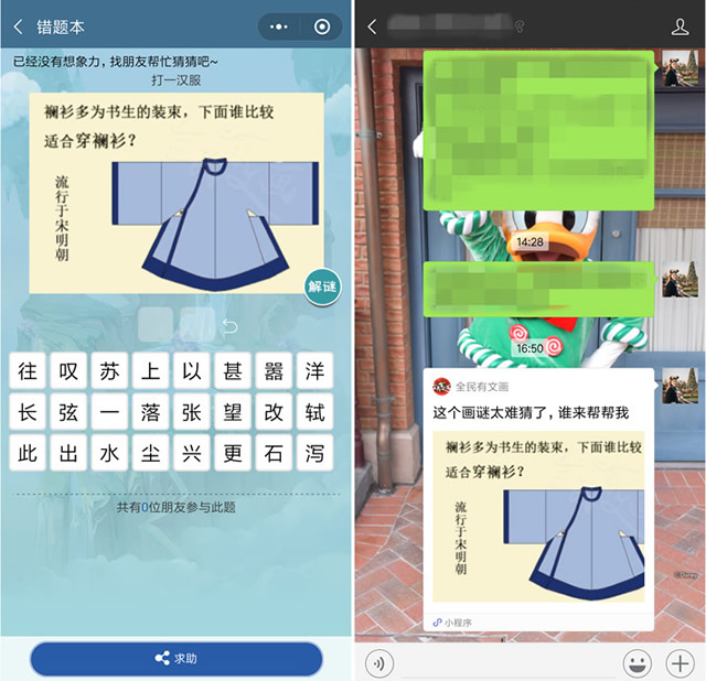 不过值得注意的是,微信官方禁止的是恶意诱导分享,并不是说所有的分享引导设计都是违规的。拿捏好边界,在产品功能设计上对用户进行合理引导,仍然有很大的施展空间。 利用用户心理 在小程序推广时,更重要的是利用社交心理做传播,找到朋友和朋友之间的关系和用户的心态。 除了设计分享场景,还可以利用用户的四个心理,刺激用户分享。 1. 满足感 “全民有文画”是一款答题小程序。用户可以通过小程序猜图学传统文化,题目包括成语、诗词、歇后语、美食、历史人物等。 因此,他们在对战结束后加入了错题本,让用户可以分享错题本给好友,满足好奇心。这样的设计不仅让分享率提升了10%,也带来了很多早期用户。