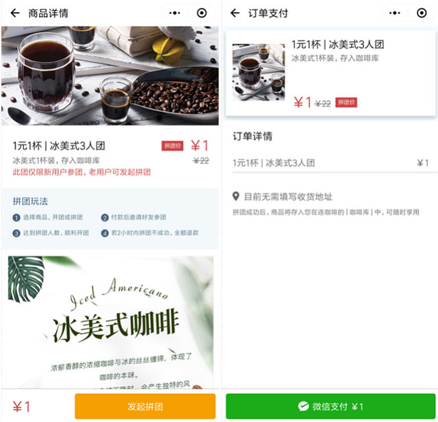 4. 占便宜 拼团和砍价都可以归为此类。拼团玩法也有很多,比如凑够人头低价买、一分钟获得拼团资格、老带新拼团等。 连咖啡推出的拼团小程序“连咖啡”,就是采用的用户喜爱占便宜的心理,从而达到近10万人拼团,并为公众号引流进20万消费用户!
