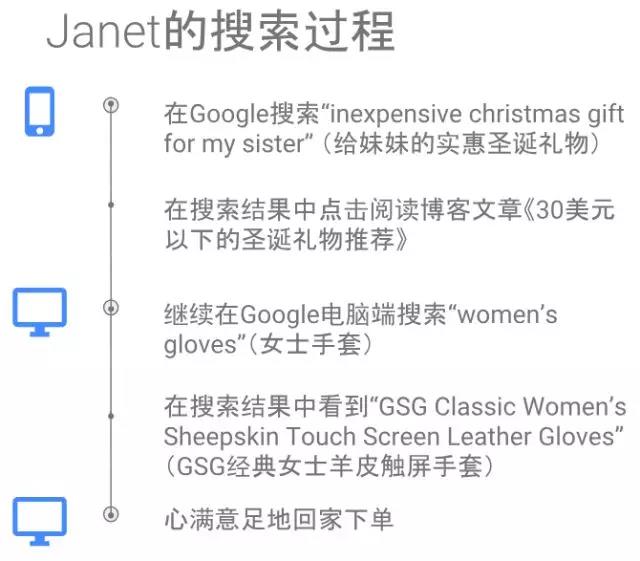 经过调查,我们发现消费者的注意力太分散了,90%的人不断切换设备,40%会参考各种渠道,而一般大家要经过13个渠道,才能最终决策。 面对这么多触达点,作为广告主,你该怎么办?如何找到一条捷径,高效而准确的传达信息、分配有限的预算,让你的营销事半功倍呢? 复杂的客户足迹难寻原因 想更早接触客户,影响他们的决定,你需要先弄清客户的购买路径,客户先看了什么广告,之后搜索了什么产品, 最后通过什么渠道完成购买。整个过程中,客户会接触到多个广告,这些广告对最终转化是否都有贡献,每个广告做了多少贡献,就是“归因”。 通常80%的营销者会认为,客户最后一步做了什么,就是购买产品的原因,这种归因就是我们常听到的“最终点击归因”,可以说十分粗暴而且局限。 随着移动时代的到来,大多数人都持续在不同的设备上切换。比如,Janet想要为妹妹挑选圣诞礼物。她怎么搜索呢?