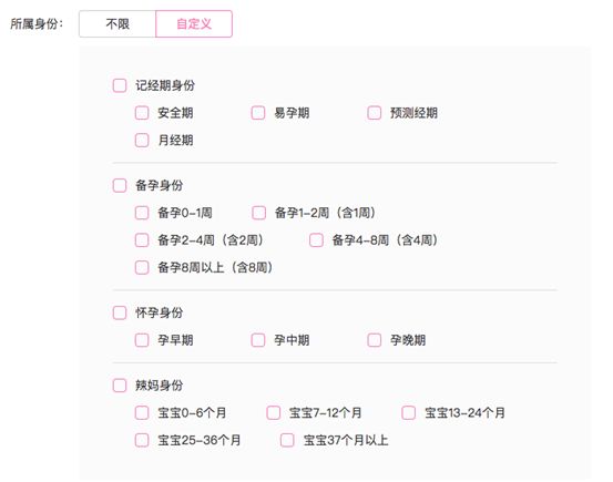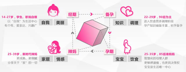 3)深度学习,重新定义精准受众 深度学习、AI人工智能等5大科技交叉,描绘用户立体画像,读懂女人心。自然属性、行为偏好等定向条件外,独有身份属性定向锁定用户深层需求,轻松瞄准目标用户,例如上文我们提到的 女性经期、备孕、孕期、辣妈完整生命周期等状态。 经期身份:经期身份用户年龄集中在14-27岁,她们的生活关键词是“美丽”、“恋爱”与“美食”。 她们喜欢在圈子分享交流护肤、美妆、穿搭的心得,也会与好友互相倾诉、吐露心事。 备孕身份:备孕身份用户年龄集中在22-29岁,以90后为主,她们更关注营养调理及备孕知识。 孕期身份:女性进入孕期身份,生活重心完全从“自我”转变为“肚子里的宝宝”,她们变得十分敏 感、谨慎,需要获得更多关爱,更饮食。此外,孕妇在产检、健康、母婴用品的需求也随着 孕期的阶段变化(孕早、孕中、孕晚)而产生变化。 辣妈身份:成为辣妈、有了宝宝之后,她们变得更温柔体贴,细腻,稳定,更喜欢分享育儿观,重视关于“家、丈夫、孩子”的一切。 那么针对女性的这些状态/身份标签,在推广中具体要如何应用呢? 我们简单举几个例子: 1)针对孕妈的摄影写真产品,可从受众的身份和兴趣两个方面的属性,来精准定位“怀孕身份”的准妈妈,同时配合他们的购物、亲子、家居生活等兴趣属性,定向推送孕妈摄影写真产品或服务。同样的,亲子类摄影更可结合宝宝年龄定向辣妈人群,如百天照、周岁照等,精准投放。