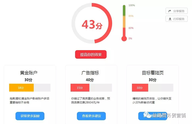 做外贸时间长的人都知道,获取海外流量最大的渠道就是谷歌和必应两大搜索引擎。要想短时间内快速提升流量和询盘就一定要在这两个平台上进行推广。与此同时,很多外贸企业也饱受这样的困扰: 同样是做谷歌(必应)推广,为什么你的效果却不如同行?网站有流量无转化?流失的访客不知道如何赢回?如何优化线上营销提升询盘? 丝路赞在今年推出的广告诊断报告就是这么一款帮你快速突破瓶颈的利器!今天就教你如何快速根据报告中的数据,找到适合你的解决方案。