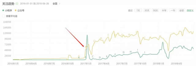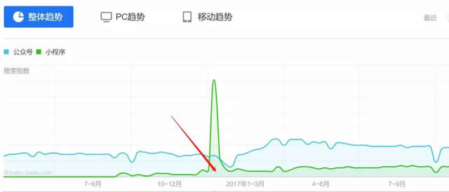 这些理论上的劣势也随时能够让小程序杀死自己,毕竟市场从来不是任何人的试错场所,也只会对结果负责。 真实中的小程序 进入真实应用场景的小程序,确实把很多优势和劣势留在了理论层面上: 理论上,相比起小程序最直接的竞争对手独立APP,其优势在于免去了“多进程操作”“重复注册”“学习使用”等繁杂的操作流程,是更适合中小团队或个人创业者的产品形态。 但在2017年12月阿拉丁指数公布的《2017年小程序生态白皮书》中,内容类小程序仅占4席,泛娱乐类小程序占7席,剩下都被“工具型小程序”或“功能入口型小程序”瓜分了份额;更值得注意的是,TOP100分别属于摩拜这样有固定使用场景的互联网公司,以及麦当劳、星巴克等传统行业,几乎没有像“足迹地图”这样的个人创作小程序。 与之呼应的是,在百度指数、新榜等第三方流量监测平台上,小程序除了在2016年10月宣布内测时有过短暂的话题量爆发,进入2017年之后的关注度始终低于同在微信生态内的“公众号”,低走到2017年1月小程序正式上线也没有将关注度拉回来,看起来就是典型的出道即巅峰。 这些真实的市场数据表明,对于在社交网络中高活跃度、更靠近主流话语圈、需求更加娱乐化的年轻用户来说,作为移动互联网时代的原住民,这些在主观上已经不成为门槛了。