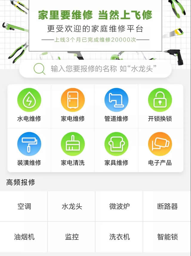 而对于另一部分来说,“场景被打扰”其实是个不存在的伪概念。因为对于这部分用户来说,缺乏相应语境的他们并不认为手机不是什么智能终端,有什么使用场景,而是简单地把手机当做“主要用来沟通”的工具,微信则是“沟通”的最主要场景。 以我在“附近的小程序”里找到的一款产品“飞修”为例。顾名思义,这款小程序是一款为用户提供维修服务的B2C平台,几乎涵盖了家用电器、数码产品、水电等几乎所有生活场景的维修业务。