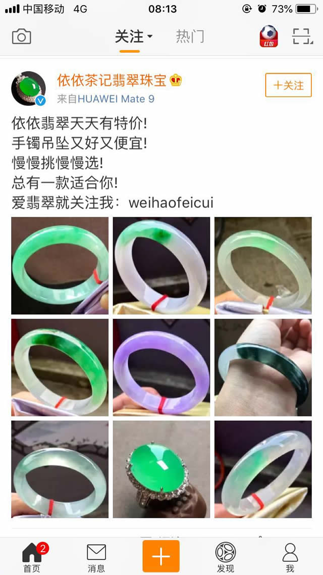 广告主要以九宫格图片样式展现翡翠外观,强烈的视觉冲击给用户留下深刻的印象。这次广告主要展示手镯,晶莹剔透的质地更吸引用户眼球。不过笔者认为,这九张图的顺序可以稍微调整一下,展现效果会更好。 除了九宫格图片之外,广告文案也是非常重要的。这则广告主要突出翡翠的价格,强调优惠活动,“又好又便宜”消除用户疑虑,从而吸引用户点击广告。