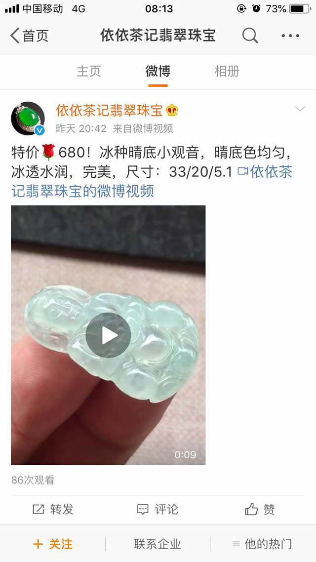 翡翠玉石这个行业投放网络广告是受到很多限制的,因为很多平台并不给机会。那么翡翠玉石行业能投放微博广告吗? 如果您具备相关的资质证书,准备好推广需要的材料是可以投放微博广告的。这里给大家介绍一个翡翠品牌在微博上投放广告的案例: