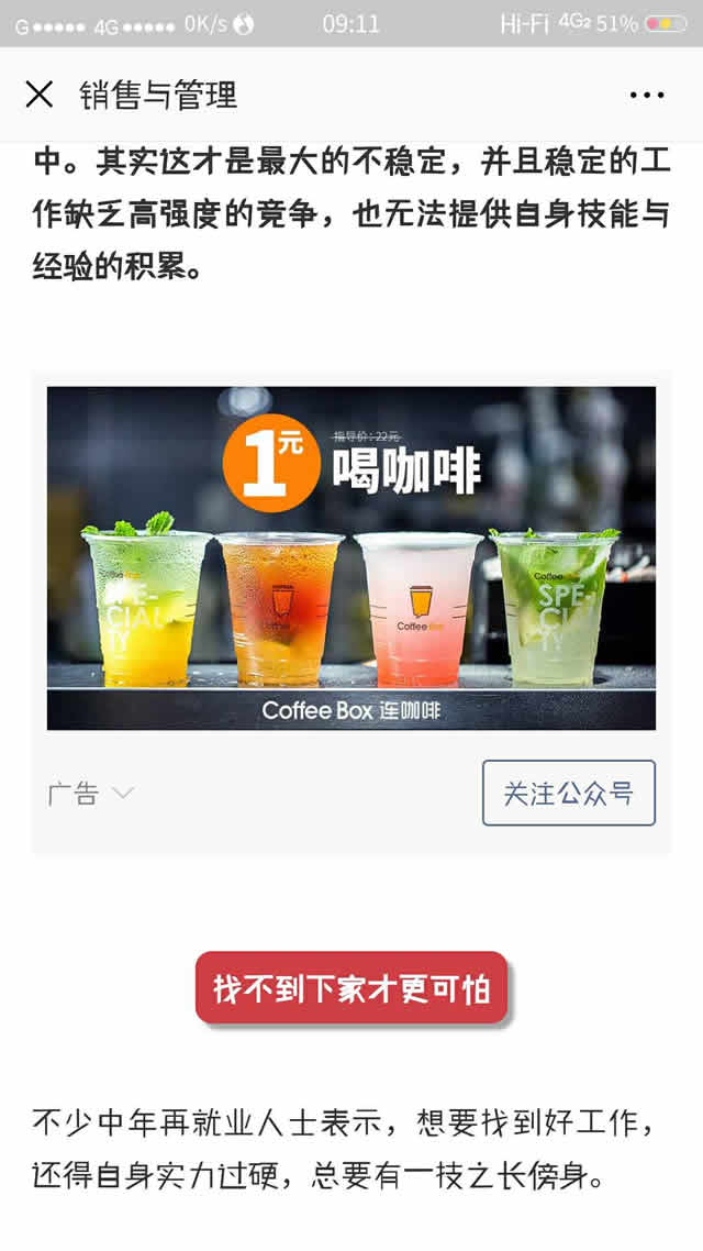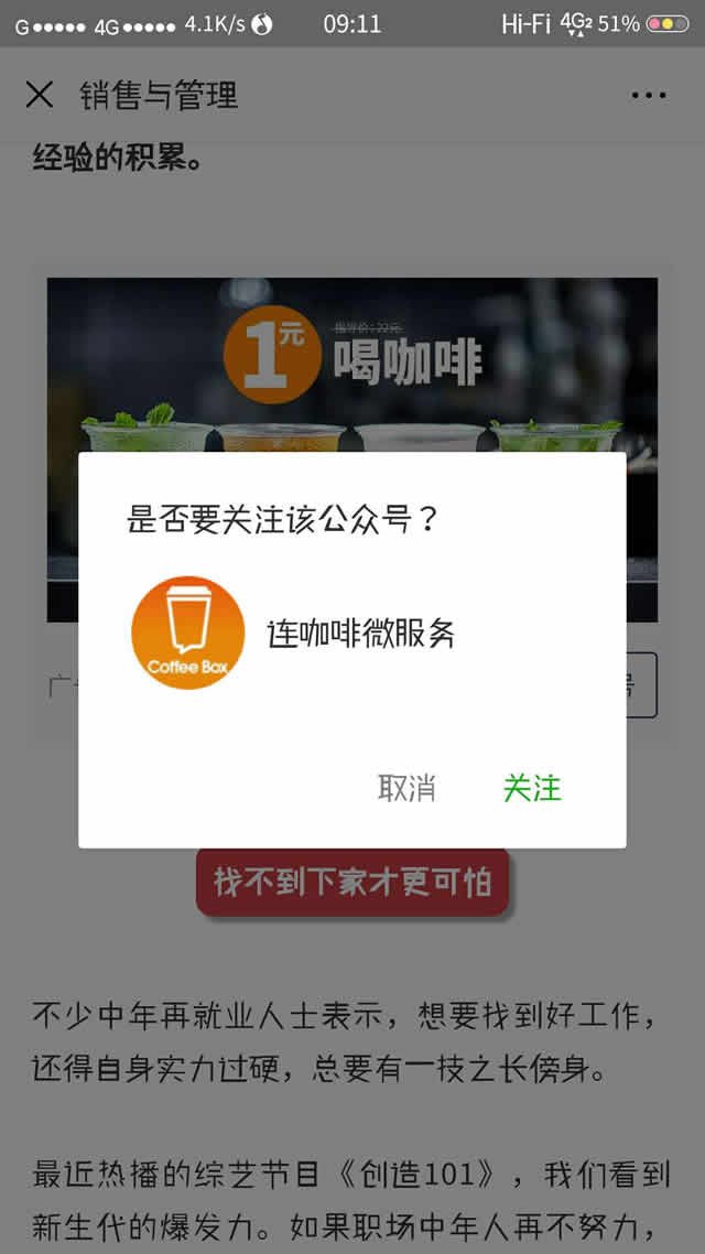以往广告主投放的广告都是在内容结束,留言区上方,而今天的广告是在微信公众号推送内容的中间部分,这里的广告同样带有广告字样,看到广告,小编也是有点小尴尬的,突如其来的广告打断了阅读,作为一个尽职尽责的广告人,看见广告并对其产生了关注行为是肯定的。点击关注关注后,用户确定点击,即可关注需要推广的微信公众号。