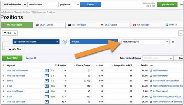 可以在Serpstat中查询你的竞争对手,然后通过出现答案框来过滤他们表现最佳的查询词: