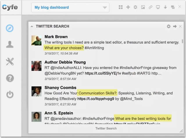 我使用Cyfe来监控和保存Twitter结果,因为它提供了一个最小化的操作界面,我可以使用它来监控无限数量的Twitter搜索。