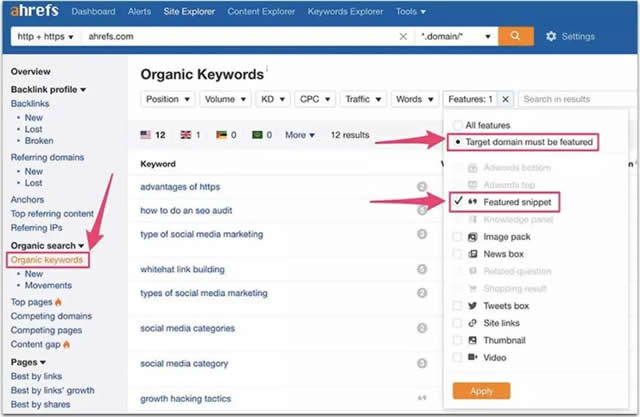 7.监控你所做的事情 Ahrefs可以让你监控你的域名所对应的查询关键词精选,因此随着它们的增多和新域名的出现,请多关注这些查询: 总结 它需要大量的研究和规划,并且不能确定什么时候你会看到结果(特别是如果你还没有较多前十的排名),但试下这样想:在Google搜索结果中的出现你的精选摘要,将会激励你更加努力地优化内容。你也会在实践的过程中实现其他重要目标: 你会从中发现数百个新的内容和想法(因此借机提高各种各样的长尾关键词排名) 你将学会更深度地研究每个主题(因此将建立更多的来源链接,因为人们倾向于链接深度文章) 你将学习到如何更好地构建你的文章(从而实现更低的跳出率,因为让你的文章阅读起来更轻松) 谷歌推广我们不仅要做关键字广告,还要认真专研推广的方法,SEO同样有利于提升网站流量,带来更多的询盘和订单,不要再抱怨推广效果不好了,这些实用的技巧赶紧用起来吧!