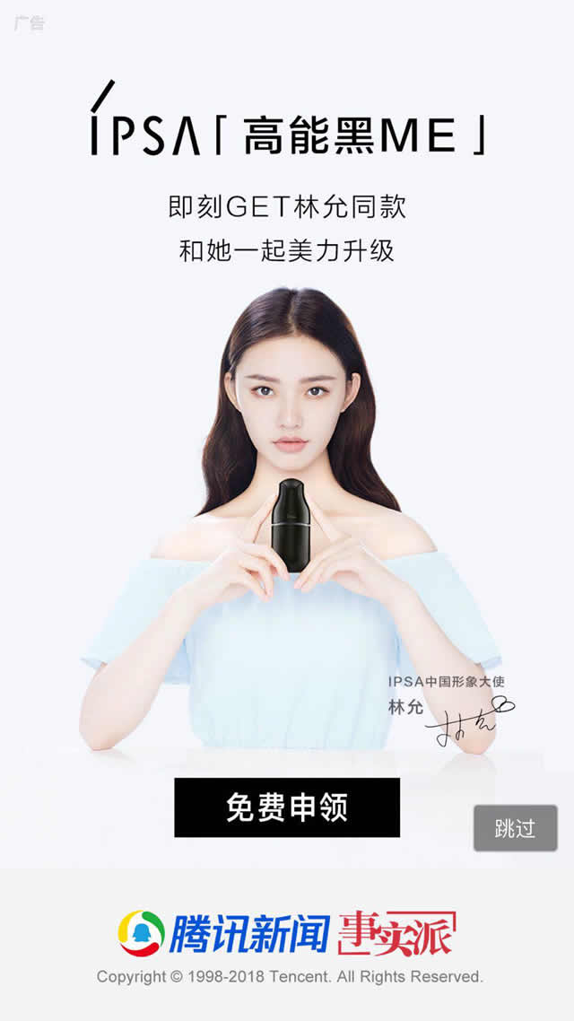 护肤产品经常有新品推出,为了使新品大卖,必须做出一系列的网络营销手段。在这里小编想说的是,无论营销手段有多好,选择推广平台很重要! 首先,想要收集客资肯定要达到相当大的曝光量,因此这里给大家推荐广点通推广平台,广点通平台基于腾讯用户的优势,可以为您的广告带来海量的曝光。 除了可以帮您实现大量的曝光外,腾讯还可以为您提供多个广告平台和广告资源位供您投放广告,例如下图IPSA在腾讯新闻的开屏广告,以开屏的强曝光效果展现给腾讯新闻用户。