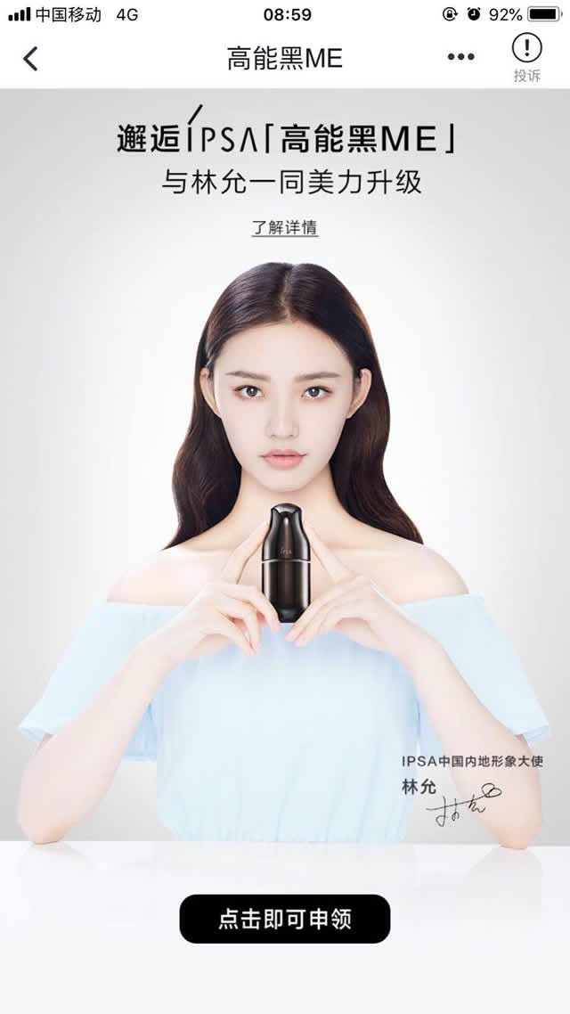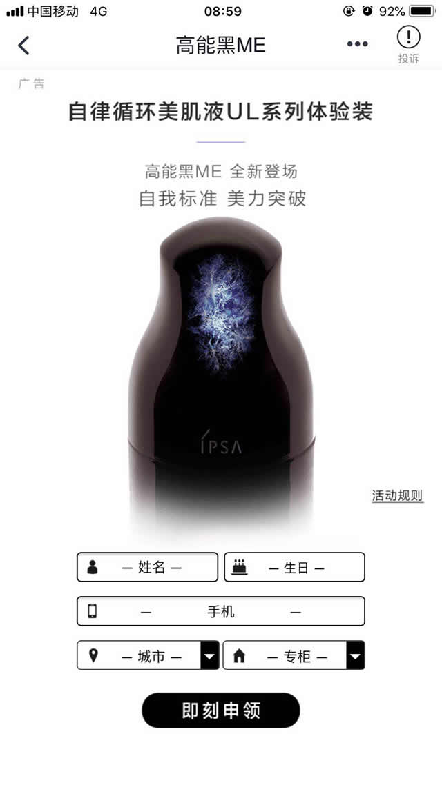 我们可以看一下IPSA的开屏直接将“免费申领”字样标黑,很大程度上抓住了用户的注意力,在落地页方面没有过多的文案设计,直接填写信息选择地点申请即可,如此赢得用户好感的落地页设计,您觉得怎么样?