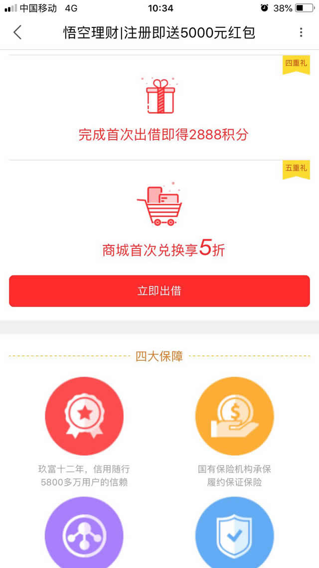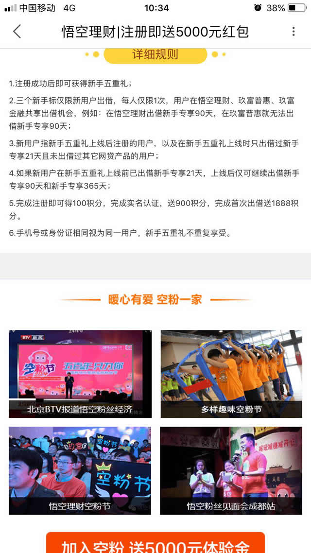 除了强调新用户的优惠以及收益外,理财产品最重要的是要告诉用户产品的安全性,提升用户的信任感。悟空理财这一点做的很好,用四大保障以及空粉节来增加用户信用,值得借鉴。
