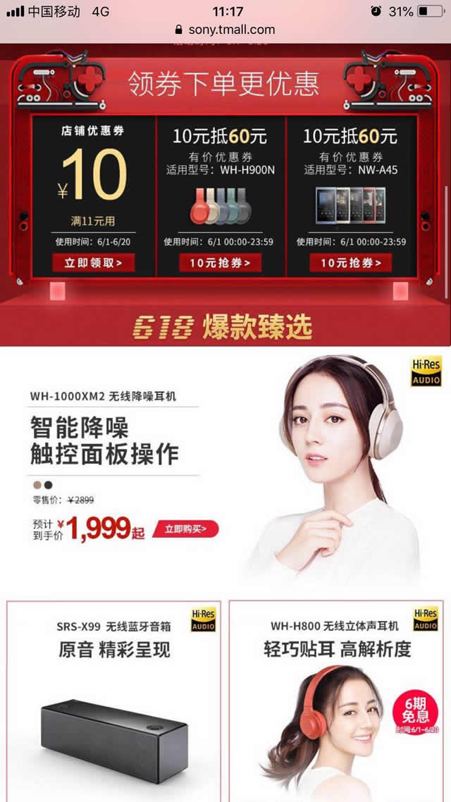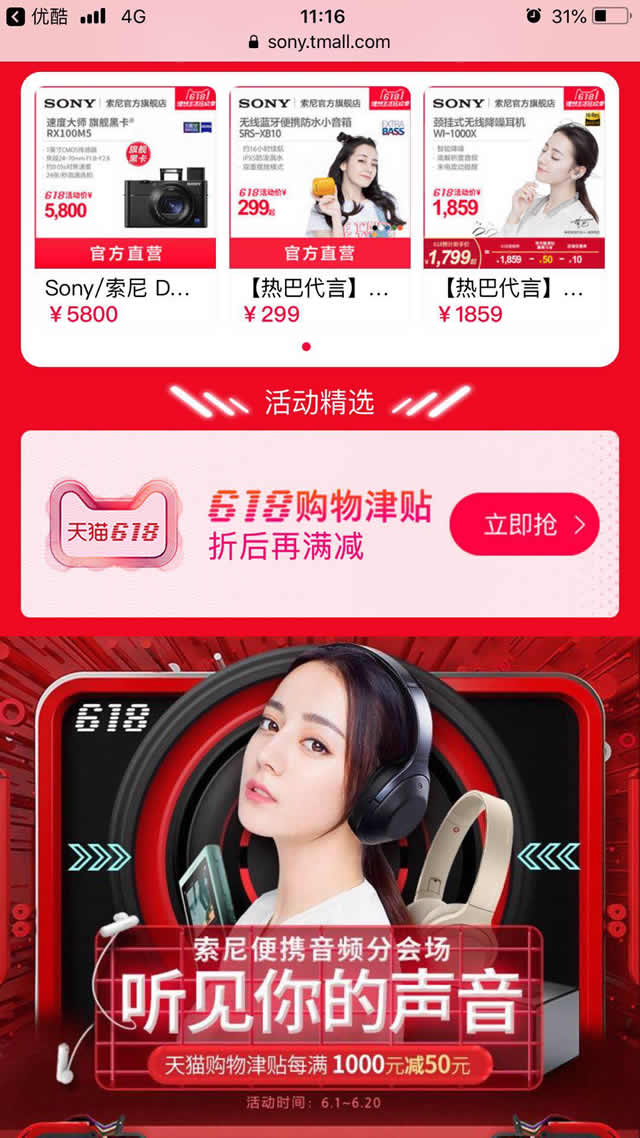 各位广告主也可以借鉴索尼的广告,不必要将所有产品都在优酷视频位中体验出来,选出一个代表产品即可,另外素材方面也要注意,明星代言,广告风格都是影响广告质量的重要因素。 跳转页设计也很值得借鉴,首先给用户呈现的就是领券的设计,以及爆款臻选,不仅符合618大促主题,也轻松的推广了产品,让用户对售卖的产品产生了兴趣。