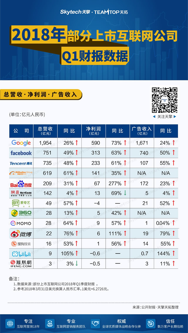 各大互联网公司的2018年Q1的财报都陆续发布了,小编为了大家六一都不过了,呕心沥血总结了部分互联网公司的财报,你最关心的都在这里了,千万不(kuai)要(na)客(qu)气(yong)! 小编主要收集了搜索营销、社交营销、效果营销、移动营销、视频营销领域的互联网公司(业务了解一下~有推广需要的~欢迎在线撩小编~),从总营收、净利润以及广告收入三个维度,包括同比变化,更贴心送上了数据解读。