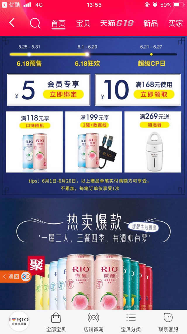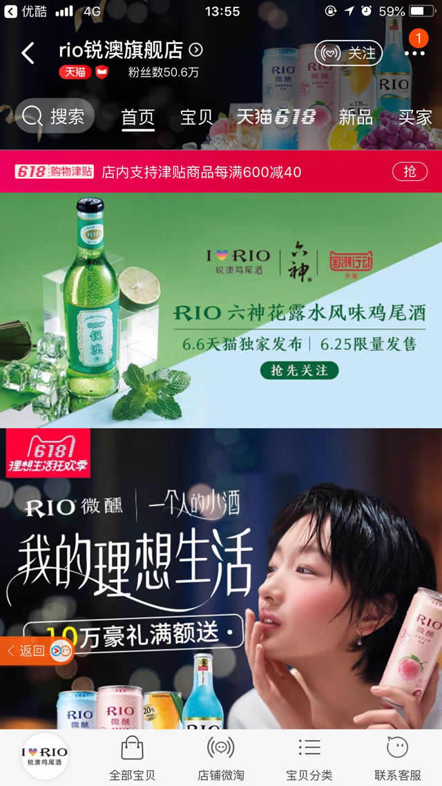 外链跳转也十分便捷,RIO直接将所有产品展现在店铺首页,推出RIO六神花露水吸引消费者吸睛,随时就是周冬雨代言的微醺小酒,推出618活动的同时,也不忘记推广新品。单单从六神花露水来说,就是不小的话题关注度。