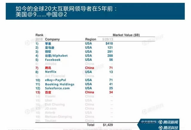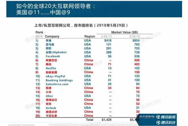 互联网女皇:90年代华尔街的象征 米克尔的明星分析师之路开始于1991年,这年她加入了知名投行摩根士丹利。 1996年,玛丽·米克尔如愿地成为摩根·斯坦利技术股票分析部的负责人,还创造出了华尔街闪耀的新职业 - 互联网分析师,就像垃圾债券代表了80年代华尔街一样,玛丽·米克尔成了90年代华尔街的象征。 2010年,米克尔辞去摩根士丹利董事总经理的职位,离开华尔街,去加州成为知名风投KPCB的合伙人。KPCB公司(Kleiner Perkins Caufield&Byers)成立于1972年,是美国最大的风险基金,其最得意的杰作是网景公司的创立。 互联网女皇报告:互联网领域的投资圣经,选股指南 1994年,米克尔在“纽约时报”上偶然看到一篇讲述创业公司马赛克研发网络浏览器的报道。米克尔立即意识到,这种网络浏览器可能会改变人们获取信息的方式,并向华尔街投资者大力介绍这家公司。 马赛克后来改名为网景,并在1995年在纽约上市。当年8月9日,网景上市首日收盘,股价从14美元的发行价暴增至75美元,创下了当时的上市公司首日涨幅记录。当年网景IPO也成为互联网时代到来的一大标志。 1996-1997年,米克尔和摩根士丹利发布了“互联网广告报告”与“互联网零售业报告”,一举奠定了米克尔互联网领域第一分析师的地位。 互联网女皇报告,无异于选股指南。她向投资者推荐的美国在线,戴尔,亚马逊,易趣等公司股票,都很快带来了超过十倍的投资回报。 互联网女皇报告中的“神预测” 业界如此看重互联网女皇报告的最主要原因,在于米克尔的那些神预测。 神预测一:2002年 电子商务领域将会在未来迅速发展 在报告发布后的4个月,随着在线支付技术的兴起,电子商务开始蓬勃发展。 2001年12月,阿里巴巴注册用户数超越100万。报告发布半年后的2002年12月,阿里巴巴首次实现全年正现金流入。 2002年12月,谷歌也发布了其在线购物平台的Froogle,开始正式涉足电子商务领域。 神预测二:2007年 美国在次贷问题上存在风险,需要予以密切关注 在随后的2008年,美国正是因为次贷问题而引爆了金融危机。华尔街遭受惨痛打击,美国经济也陷入严重衰退。 神预测三:2009年 用户将主要通过移动设备来上网,传统PC笔记本将成为次要选择 一年之后,智能手机销量首次超越PC。 神预测四:2013年 穿戴式,移动式设备的成长 预计未来几十年内,可穿戴设备及新的设备类型:智能眼镜Google Glass,体能追踪手环还有无人机,以及无人汽车等将迎来春天。如今,这些都成为最火热的创业方向。 1、全球20大互联网公司中国已有9家 报告统计了全球20大互联网公司,5年前,中国互联网公司进入名单的仅有2家,腾讯和百度。而今年则有9家,已经逼近有11家进榜的美国。