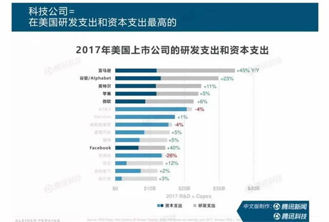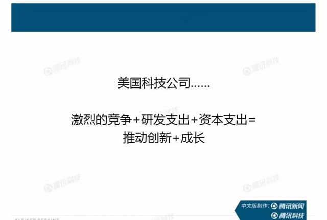3、美国科技公司研发投入占比惊人 报告指出了美国科技公司资金和精力主要的投入方向,具体而言,驱动着美科技公司成长的三个要点是竞争、研发支出和资本支出。 其中,包括亚马逊等美国知名公司每年在研发投入上的占比都超过了40%。