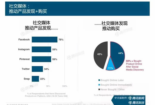 4、社交媒体成为产品推广最佳途径 报告指出,一款产品被用户的发现途径,从大的方面可以分为两部分:一是搜索;二是始于feed流的个性化展示。在后者之中,社交媒体中的产品展示扮演着愈发重要的角色。数据显示,55%的用户曾在社交网络上发现商品后选择购买。 这基本确认了一个大趋势:此后无论在国内还是在国外推广产品,能否获得住社交媒体中的曝光率,将成为产品增长和发展的胜负手。