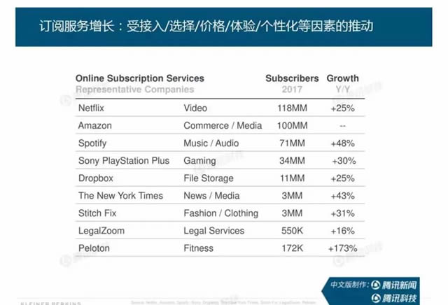 5、“订阅”成为产品销售增长的最强增长点 报告指出,全球用户的产品购买习惯和偏好也发生了变化,主要表现在来自订阅的产品购买比重显著增加。报告列举了Netflix和Amazon的商业订阅及媒体订阅等,相当于国内用户订阅专栏或是购买视频服务等。 这意味着,如果你在卖货,但却还没有在“用户订阅”上进行挖掘和动脑筋,那你基本已经Out了……