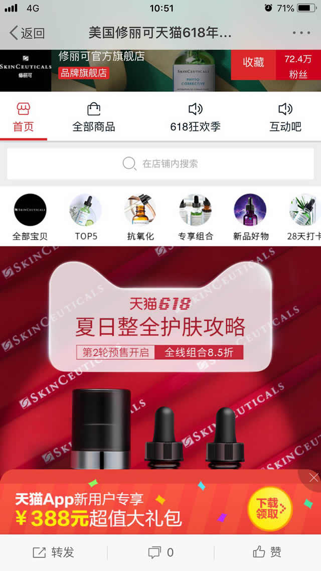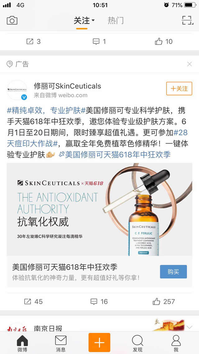 修丽可在微博的广告并没有直接产品,文案也不简短。虽然文案不简短公司公关公司有哪些,但还是有很大优势的,例如修丽可发起了与微博用户的话题互动,如:#28天痘印大作战#,吸引用买产品的同时参与活动亲自见证产品效果,让用户产生信赖。互动的同时,还有一个附加条最新发布的新闻消息件,有机会赢得全年的优惠,有效的提升了用户参与活动的意愿。 修丽可的营销活动日也很明确,参加天猫618年终狂欢季,但是与其他护肤产品不同的是修丽可给大众展现的不仅是618的优惠券发放活动和每日好礼,还有618前的预热营销,活动力度一波接一波~用户不用等到618再买了。