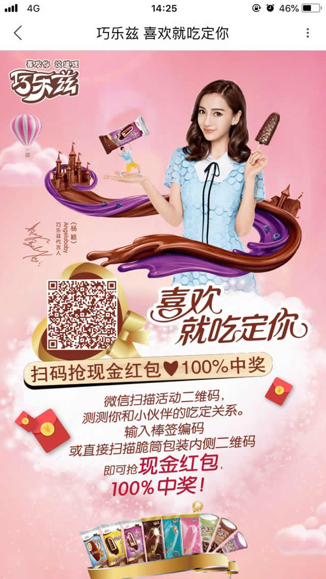 在落地页展现方面,巧乐兹的广告语是:喜欢你就吃定你。不仅可以和消费者形成用户,也可以带动消费之间的互动,带动线下销量。