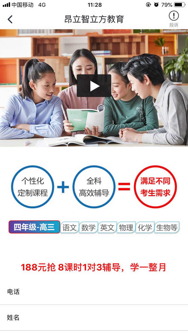 利用短视频的方式推广自己的产品,我们可以看到昂立智教育在落地页内用的是短视频广告,这种新型的广告形式一直是时下很受欢迎的方式。
