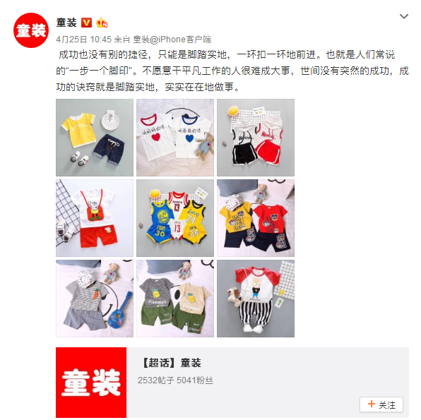 1、博文信息要“养眼” 微博信息想要抓住用户的注意力,那么我们推送的博文信息一定要够“养眼”,童装行业如何做到“养眼”呢?主要还是要从我们的童装款式和风格入手,逗趣可爱,萌趣活泼的服装款式更符合儿童的形象,那么我们的微博博文可以重点突出这些风格,发一些比较有特色的童装款式图片,抓住用户的眼球,吸引用户进行咨询。