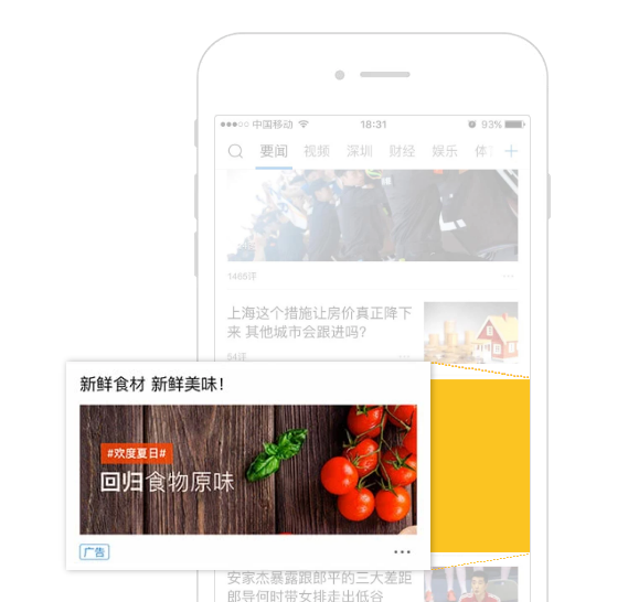 通栏大图广告以一张富有视觉冲击力的大图广告展现产品内容,图片中文字内容尽量简洁,展现主要的产品亮点即可。大图广告适合美食、生鲜、婚纱摄影等行业做推广。 腾讯新闻广告支持网页推广、移动应用推广、电商推广等等,多元化的推广支持满足企业不同的推广需求,适合中小型企业投放广告。