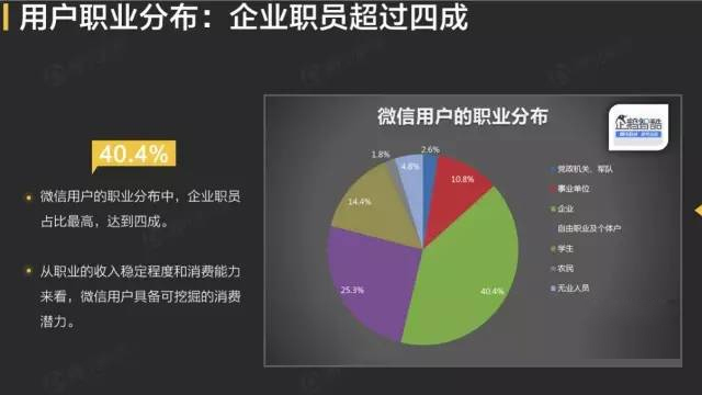 性别上,目前微信的用户主要以男性居多,男女比例2:1。 人员构成上,以企业职员为主,占到了40.4%。值得关注的是学生的比例14.4%,并不是很高。 95后更倾向使用QQ空间,95前则更多使用微信。微信95前使用比例达到,39.44%,95后则仅为20.42%。 从人群来看朋友圈是很适合投放手游广告的,企业职员的消费能力和减压需求来说,如果广告制作的有吸引力相信下载量和品牌传播是很好的。如果您对朋友圈广告有需要,欢迎咨询我们。