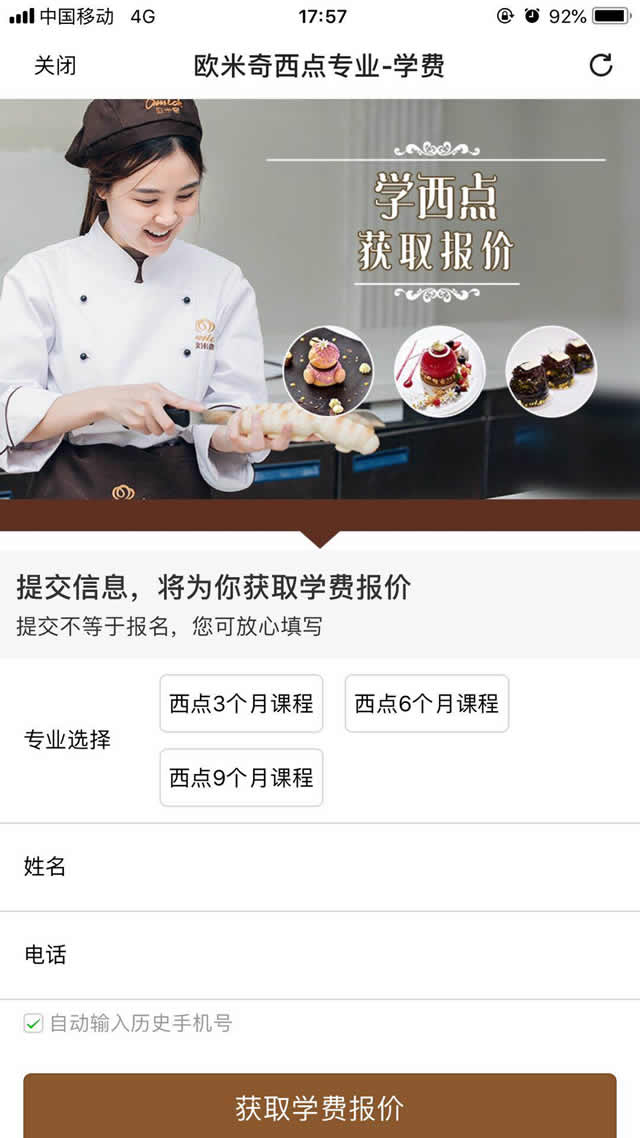 西点学院的广告是在腾讯新闻首页推广的信息流广告,图文结合的广告很简单,直接以简单的文案激起用户创业的想法,例如文案:20岁不去追梦,30岁都在帮别人圆梦,激起用户创业的心理引导用户点击。各位广告主在做其他方面培训的时候,也可以试试这种创意文案。 落地页展现方面,可以直接看出广告的目的以收集客资为主。用户看广告的时候,往往担心会有人不断的电话联系促使其报名,但是在这则广告中我们可以发现,广告设置直接告诉用户:提交不等于报名,因此用户填写信息的意愿很高。这也是值得借鉴的一种表单信息收集方式。