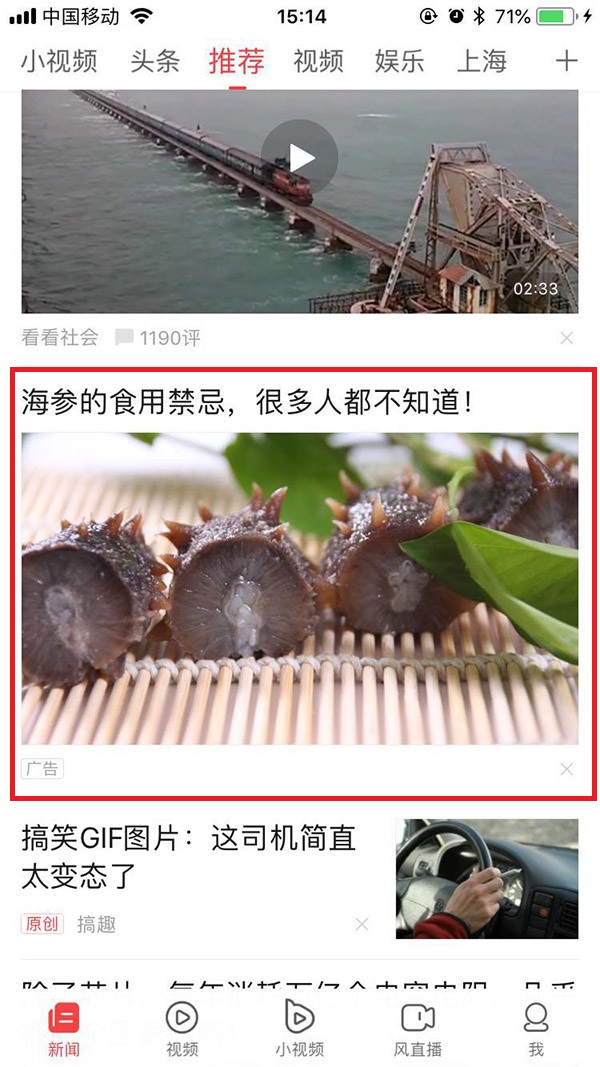 既然是海鲜类的水产品,用户感兴趣的肯定就是食用方法以及海鲜的“鲜”。没有人会拒绝美食,那么我们的外层图片可以设计为海鲜的美食图片,优质高清的图片更能吸引用户的注意力,从而提升广告效果。 2、外层广告文字引导 广告语在广告中占据非常重要的地位,因此,我们外层广告不仅图片设计要美观,广告语的设计也是非常重要的。例如这则广告的广告语: “海参的食用禁忌,很多人都不知道!” 很多人对海鲜的食用是比较讲究的,而且也有人对海鲜过敏等等,这里的广告语并不是直接推销产品有多新鲜有多好,而是选用人们比较关注的“食用禁忌”来吸引用户点击广告,心机够够的。 3、广告落地页设计