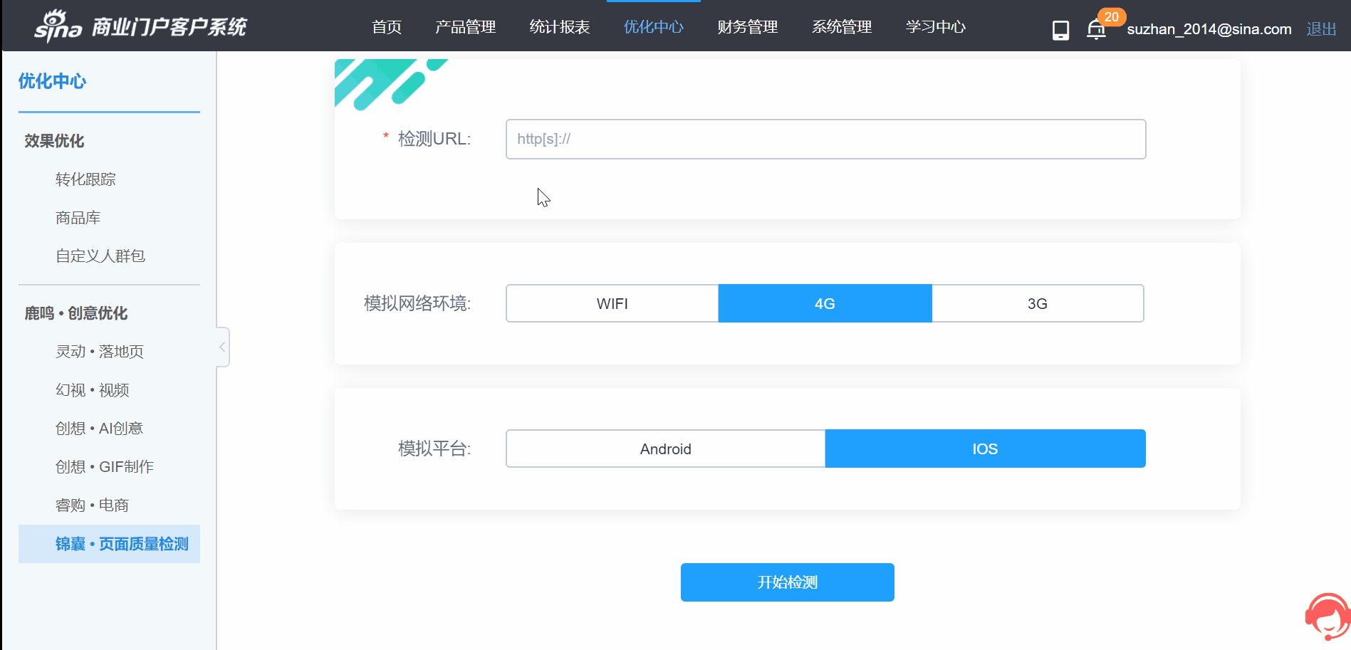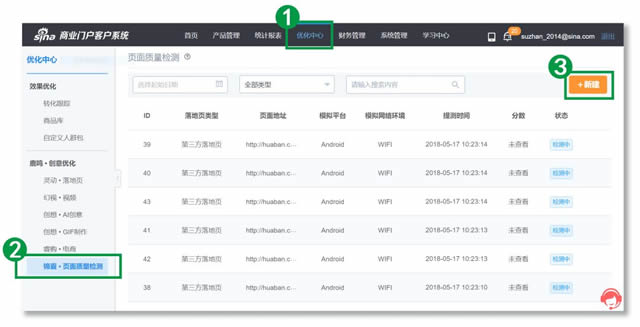 为了提供更优质的落地页,小编可是一刻都没有松懈,力求为大家带来更新升级第一资讯。关于页面质量检测已经上线啦,还请小主们查收呐~ 网页加载时,会看到有一个在不停旋转的圈圈,小主们是不是已经失去了浏览网页的兴趣?对于普通的网页是如此,对于“吸引时刻”短以秒计的广告而言,这样的状态更是导致:广告展现的“大门”还未敞开,客户已经严重流失。 既然页面可访问性如此重要,有没有什么工具,能给落地页做个全面“体检”,及时发现页面问题,避免这样的现象出现呢? 咚咚咚,敲小鼓——锦囊·页面质量检测,为检测页面可访问性量身打造!如此诱人?话不多说,快去看看~ 页面质量检测 【锦囊·页面质量检测】是一个旨在检测不同网络环境下网页的可访问性,并给出一些合理化建议的工具。ta可以帮助投放落地页的小主们及时发现页面问题,根据建议自行改善页面质量。 核心优势 1.模拟全覆盖网络环境 2.直观显示加载全进程 3.全面归类统计信息 4.提供具体的改善建议 如何操作 登陆新浪商业门户平台,进入【优化中心】-【锦囊·页面质量检测】-点击【新建】