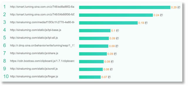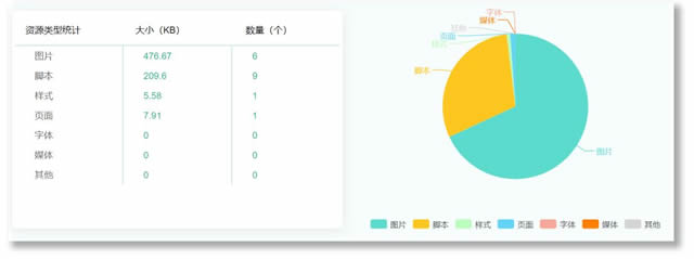 统计页面各类资源大小及数量,并以饼状图显示各部分所占百分比,页面组成可以一目了然。 3.资源加载耗时排行