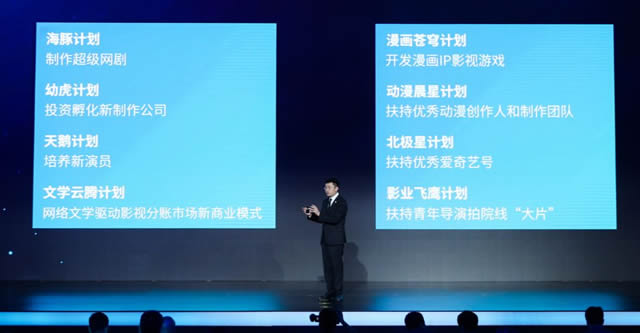 海豚计划:制作超级网剧; 幼虎计划:投资孵化新制作公司; 天鹅计划:培养新演员; 文学云腾计划:网络文学驱动影视分账市场新商业模式 漫画苍穹计划:开发漫画IP影视游戏; 动漫晨星计划:扶持优秀动漫创作人和制作团队; 北极星计划:扶持优秀爱奇艺号; 影业飞鹰计划:扶持青年导演拍院线“大片”