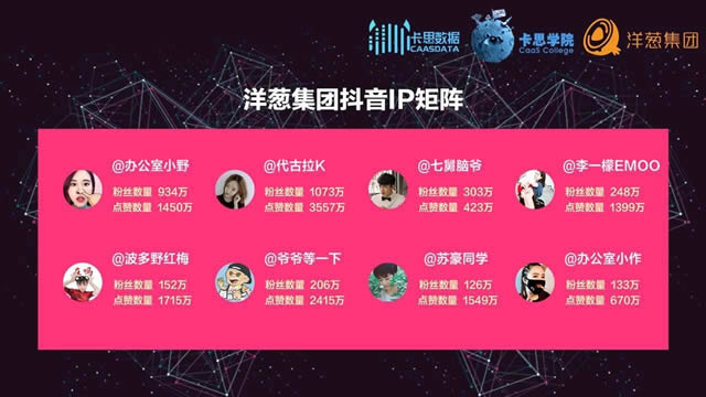 爆款常有,但爆款过后维持住优异表现的不常有。抖音红人代古拉K在4月18日凭借爆款视频进入观众视野后,在接下来一个月的时间内涨粉1000万。这背后,是运气,还是严密的方法论? 今天跟各位分享下洋葱集团在IP打造孵化以及运营方面的一些技巧。去年我们有办公室小野的全球现象级IP,今年2月-4月有代古拉K的现象级IP。你可能会想,是运气的成分更多一些,还是说偶然的背后有它的必然性?那么就我个人的感觉而言,认为能够从这一系列的IP打造中,摸索出一些规律、总结出一些方法论来。 目前,办公室小野的抖音有接近1000万的粉丝,代古拉K从4月18号那条数据激增的短视频开始,一个月的时间内涨粉1000万。整体的数据可以说是非常有代表性,可以称之为一个现象级IP。实际上,除了代古拉K外我们还有其他的系列IP,洋葱集团在抖音这块有40多个账号,且还在不断增加中。 洋葱星校——IP孵化器 洋葱有一个独立的IP孵化器,在我们内部称之为星校事业部,作为一个品牌出现的话叫做洋葱星校,所有的IP都是从这个星校里面“孵化”出来的。我们的孵化模式借鉴了学校培养人才的经验。 办公室小野是洋葱集团的第一个IP;代古拉K今年2月份进入公司从零开始打造,经过一段时间的孵化,4月18号在抖音上爆发;七舅脑爷是一个全网型的IP,也是目前全网范围内的头部烧脑短视频;第4个李一檬EMOO,是最早进入短视频的IP,也是最早入驻抖音的账号之一(2017年6月);波多野红梅是2月份入驻抖音平台的新IP,目前在抖音、微博都有出色的表现,微博上的整体阅读量超过1000万。