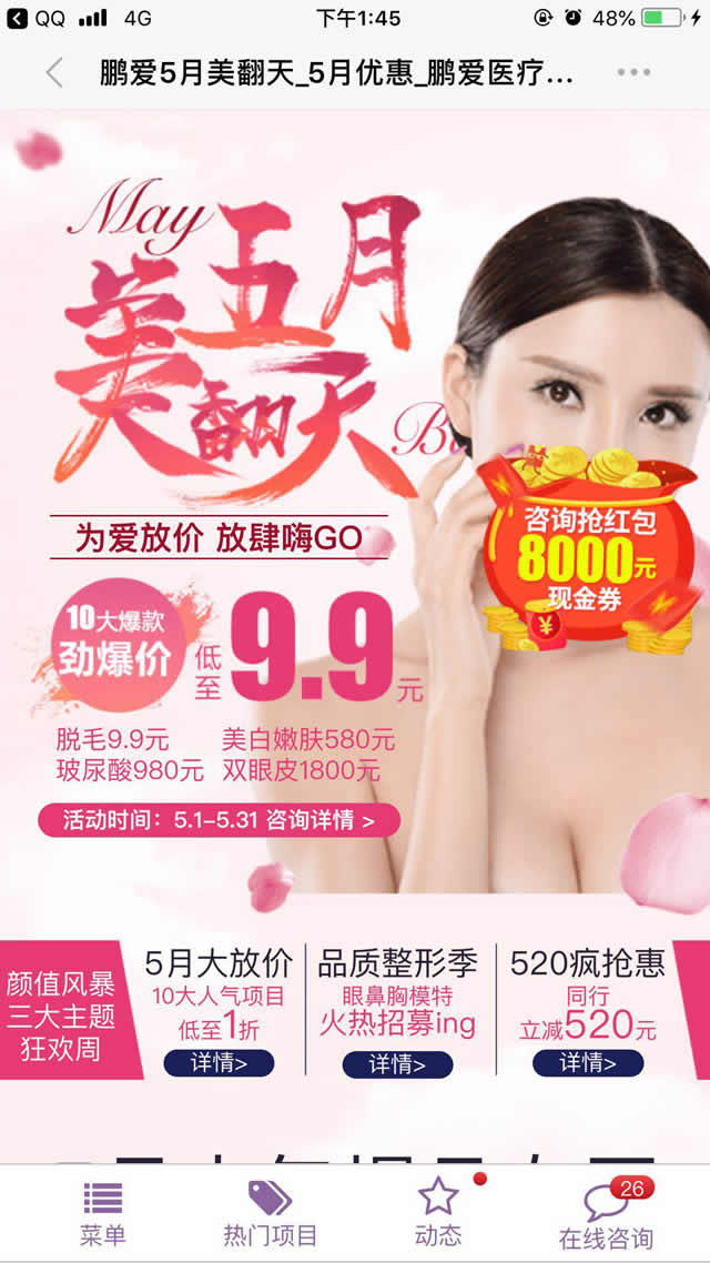 落地页不仅要呈现出美容的优惠,同时还要设置相关快捷键让用户一键直达自己想要了解的内容,例如:落地页底部可以设置菜单以便用户查询美容项目、价格。 三、互动要及时